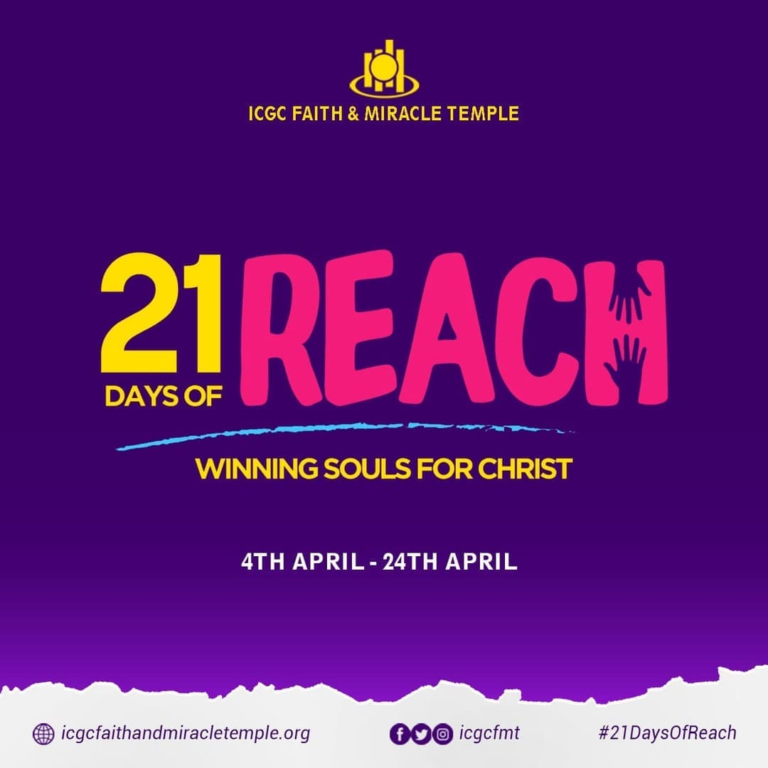 This is an ICGC worldwide event aimed to take the gospel into our communities. During this event, every ICGC member is charged to embark on a personal soul winning drive to share the gospel with anyone - whether in person or on social media. Members are mandated to win at least one soul for Christ...Read More