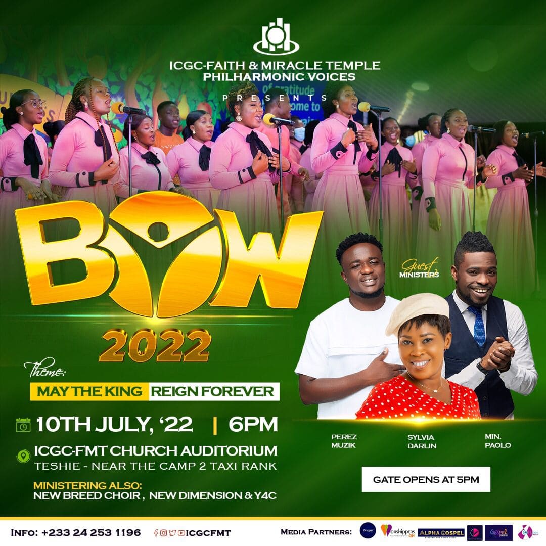 BOW which is an acronym for Bring Our Worship is our annual flagship worship programme, which started in 2014 under the inspiration of the Philharmonic Voices and the Leadership of Rev. Dr. Samuel Yaw Blessed.The programme's goal is to encourage congregants to praise, worship, and thank God.